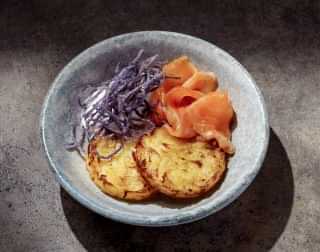 Картофельные драники/ лосось/ сметана/ хрен